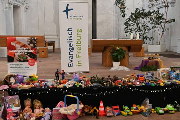 Lange Tische voller Kuscheltiere, Puppen, Spiele, Autos, Bauklötzen und vieles mehr waren vor dem Altarbereich aufgebaut. Oberbürgermeister Martin Horn, der Schirmherr der Aktion, war vor Ort und teilte mit der evangelischen Dekanin Angela Heidler und dem ökumenischen Organisationsteam die Spielsachen aus. Sie blickten in zahlreiche strahlende Kindergesichter. Und manches Kind tat sich sichtbar schwer zu entscheiden, welches Spielzeug es aus der großen Menge nun nehmen solle. Das Organisatorenteam war sehr zufrieden mit der Aktion. „Einen solch großen Andrang hatten wir uns gewünscht“, sagten die evangelische Pfarrerin Nadine Kempf und die katholische Dekanatsreferentin Ruth Scholz. Sie seien aber trotzdem überrascht gewesen, als sie den großen Andrang und die lange Schlange sahen. Für sie war die erste Freiburger Geschenktauschaktion ein voller Erfolg – und erst recht für die zahlreichen Kinder!